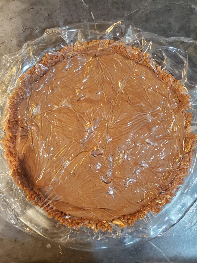 - Adding the pudding into the crust, covering, and chilling